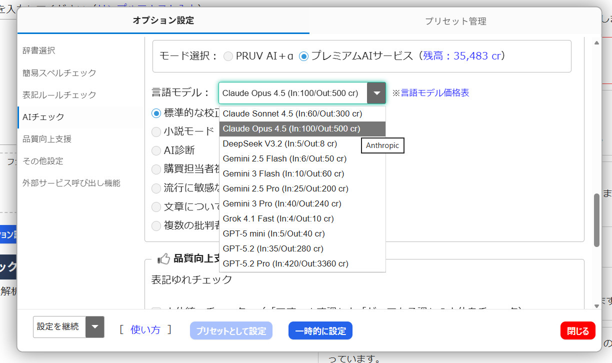 カテゴリー:新機能 作成日:2026-02-05文章校正サービスPRUVは、世界最高峰の生成AIモデル(GPT-5.2、Claude Opus 4.5、Gemini 3 Pro Previewなど)を利用して高度な文章校正・推敲ができる新サービス「プレミアムAI」の提供を開始いたしました。